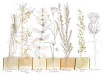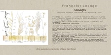 Françoise Lesage qui a exposé Sauvages, un journal botanique à la Maison CFC, puise aux mêmes sources que Marie Gevers : fleurs, nuages, ciel, vent, étoiles… Elle nous invite à les regarder de plus près et à nous émerveiller de leur beauté à travers ses dessins, broderies, tissages et teintures.