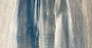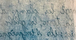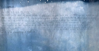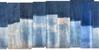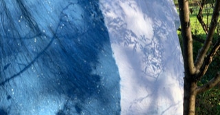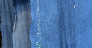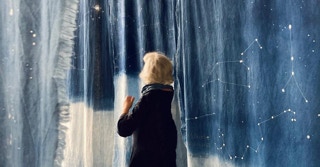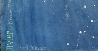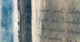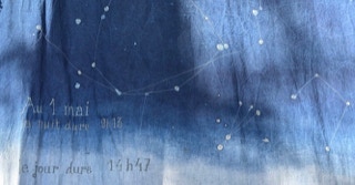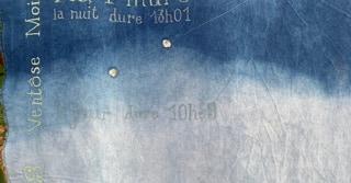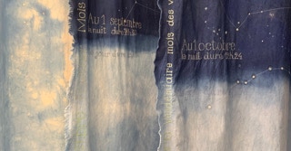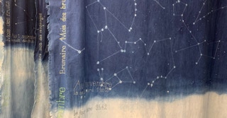 Portée par les mots de l’autrice tout autant que par le Mémorial du naturaliste initié par son père Florent Gevers, Françoise Lesage a imaginé une installation artistique. Tissus patiemment teints à l’indigo, broderies et dessins jalonnent l’imprégnation du temps, celui qu’il fait et celui qui passe. En circulant entre ces pièces de toiles créées pour l’occasion, on entre dans l’azur, dans les constellations et les nuages.