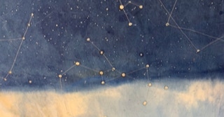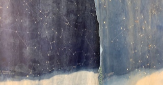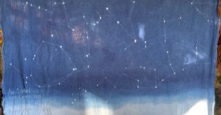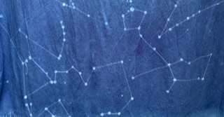 Sur la partie foncée sont représentées les constellations à minuit du même jour. Les étoiles sont faites en réserve à la cire et les traits des constellations sont brodés à la machine.